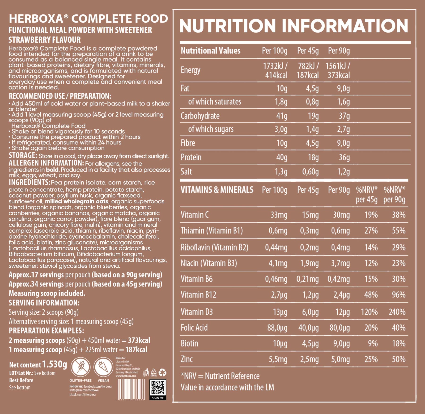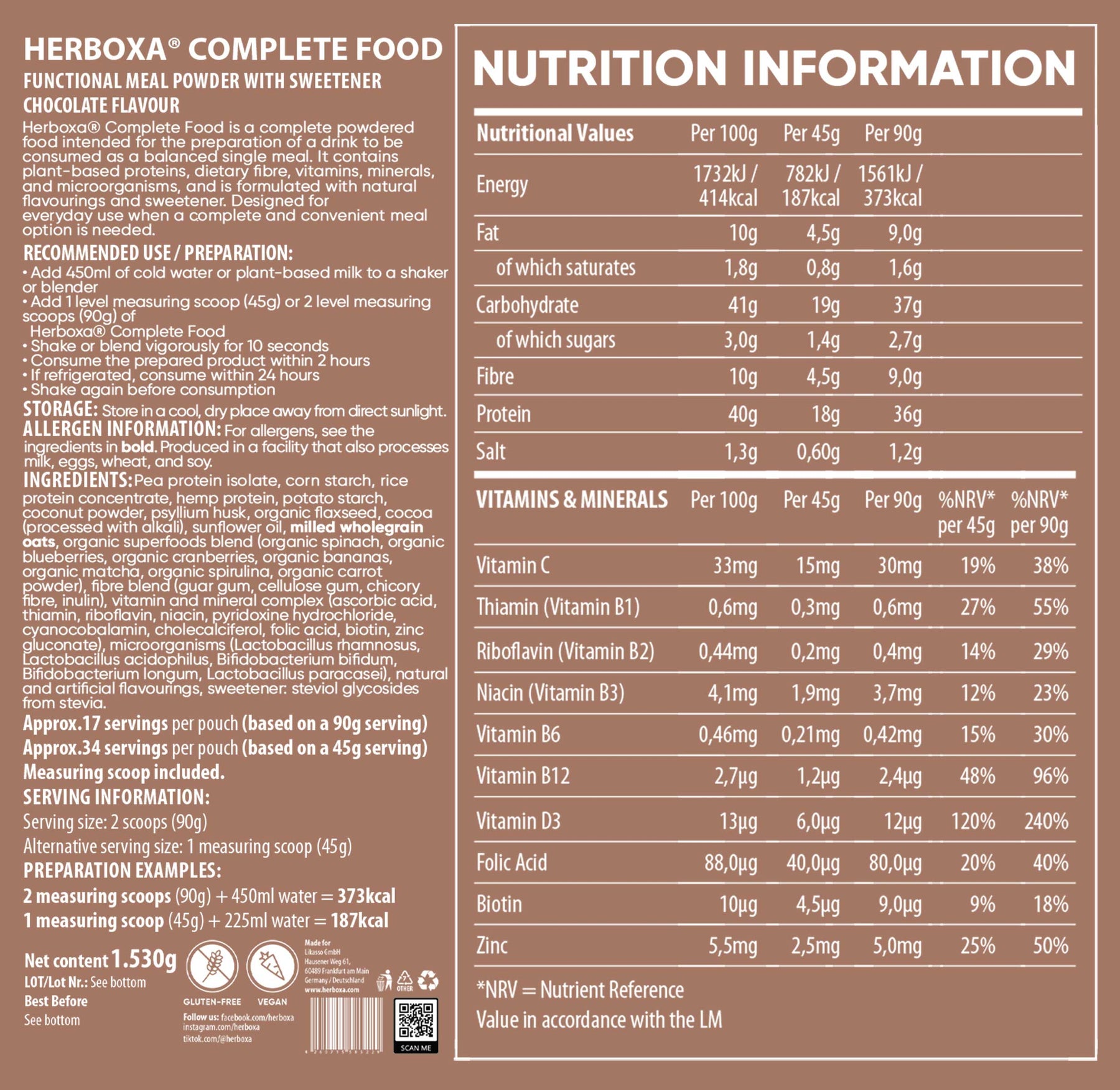 Herboxa Complete Food on ravinteiltaan tasapainoinen ateria, joka sisältää proteiinia, kuitua, hiilihydraatteja, rasvoja sekä tärkeitä vitamiineja ja kivennäisaineita yhdessä annoksessa.